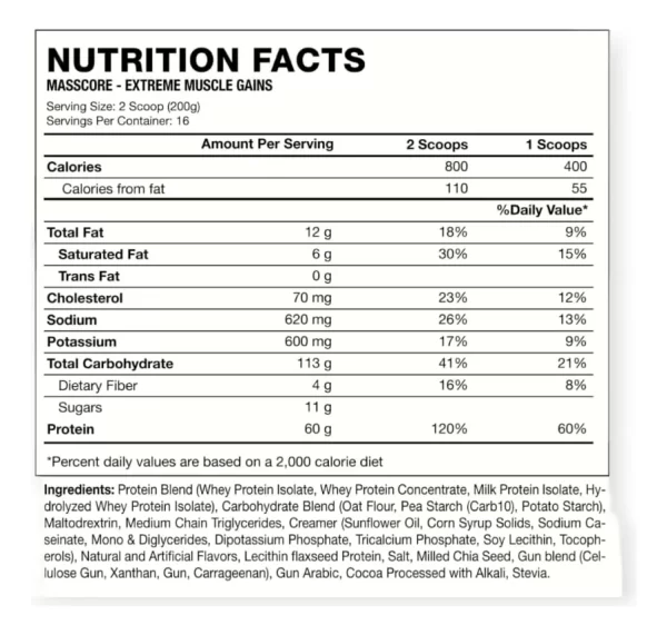 Hexacore Masscore es un ganador de peso rico en macronutrientes especialmente diseñado para las personas que buscan añadir calorías adicionales para maximizar las ganancias de masa muscular y para las personas con una tasa metabolica elevada. Cada dosis de Masscore proporciona proteínas de calidad premium y un total de 800 Calorías por servicio (2 scoop) para ayudar a mantener y desarrollar la musculatura. Masscore puede ser consumido en cualquier momento del día, especialmente después del entrenamiento, entre horas o incluso para sustituir una comida.
