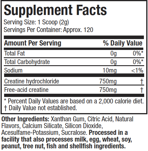 • CON‑CRĒT® Creatine HCI: creatina patentada con solubilidad superior y absorción optimizada.
